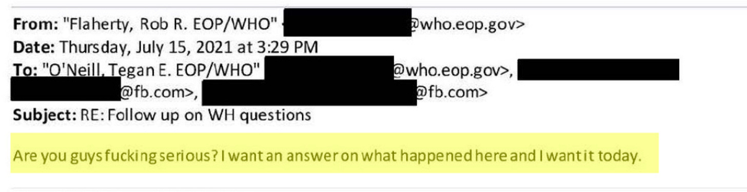 Flaherty also conveyed that his communications came with the backing of the very top echelons of the administration: “This is a concern that is shared at the highest (and I mean highest) levels of the WH.”