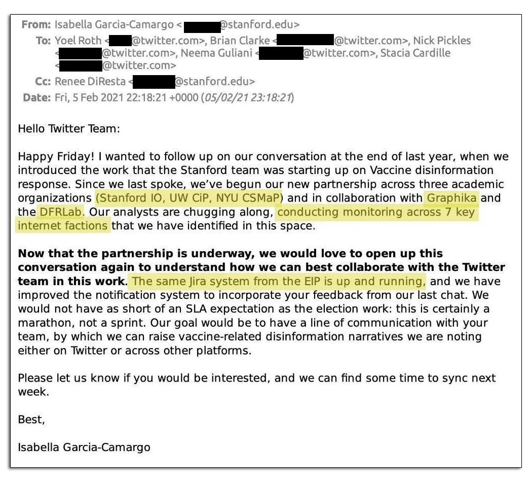 Twitter Files also show that the Virality Project began work in late 2020, almost immediately after the election: “Happy Friday, I wanted to follow up on our conversation from the end of last year” wrote one project coordinator:
