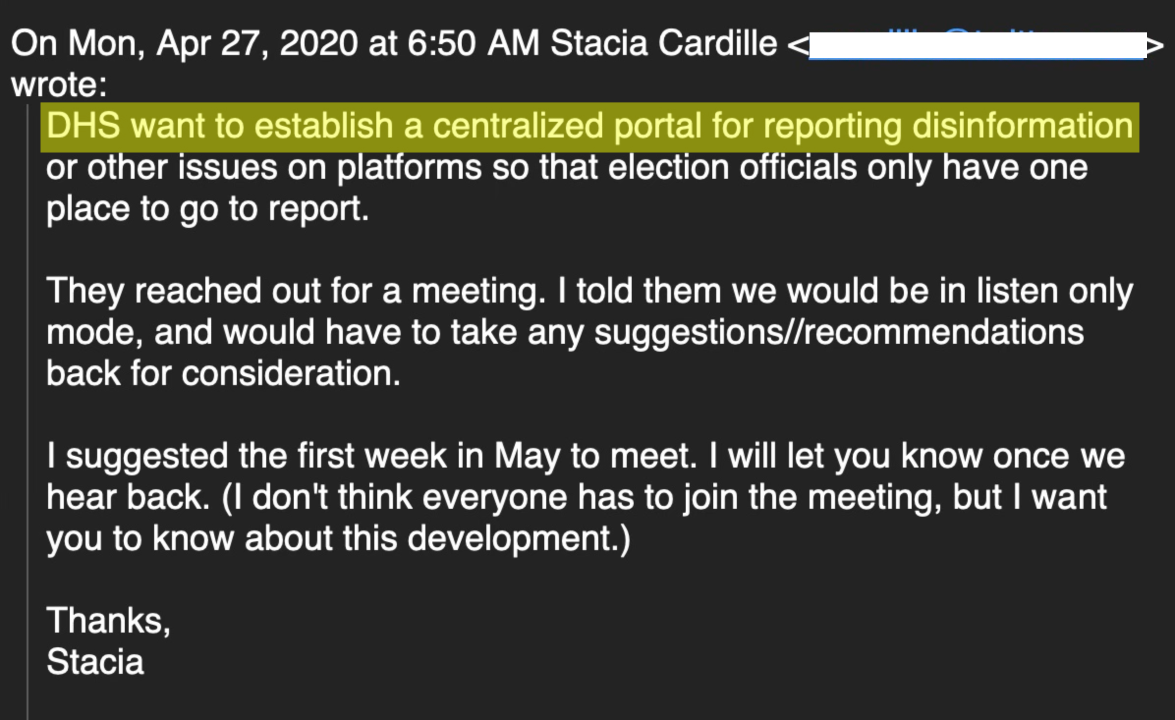 The below email, from Taibbi’s reporting, show’s Twitter staff knew DHS was behind the initiative, and that “recommendations” from EIP and the Virality Project carried with them the weight of the federal government: